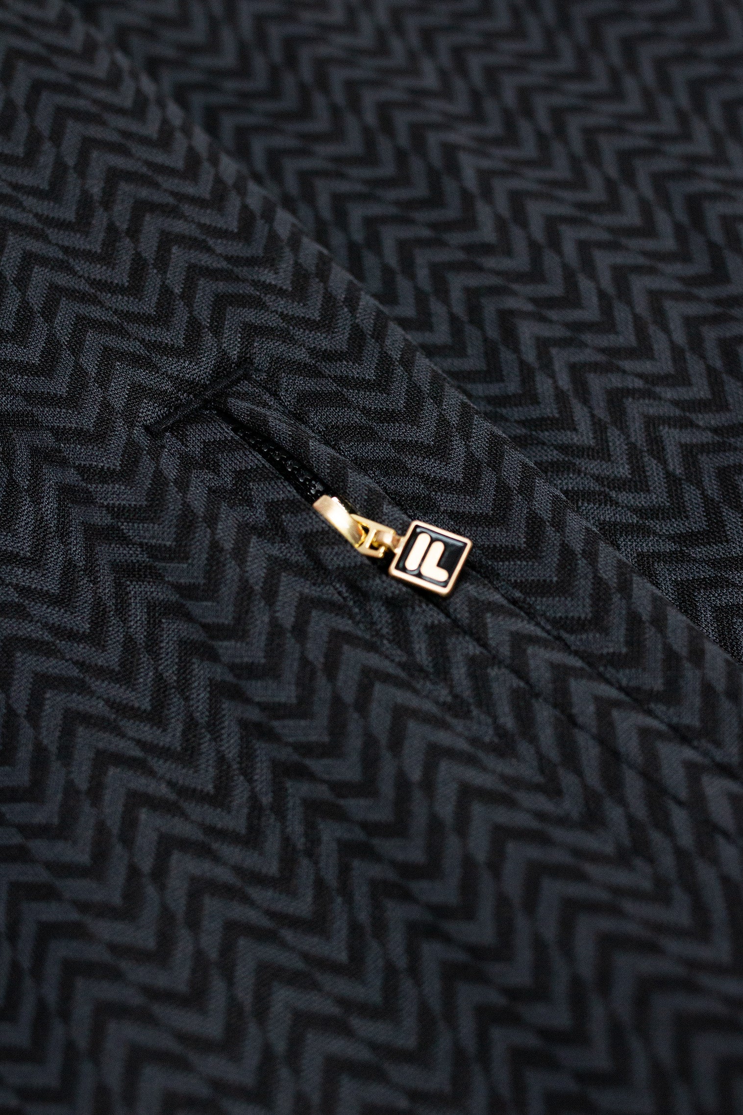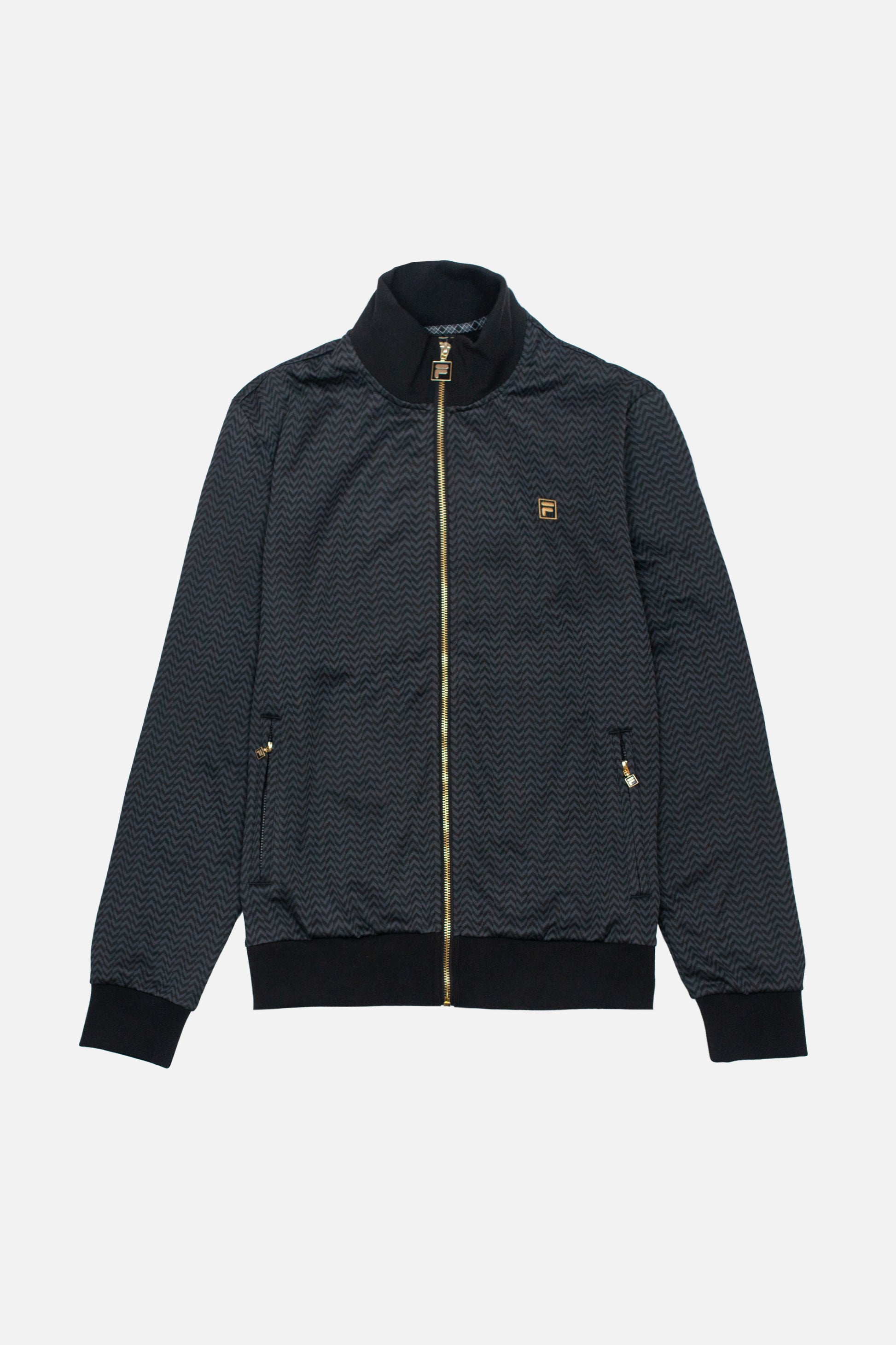 A lovely new addition to the Fila Gold label, the Mathers Herringbone Track Jacket in a lovely black and slate with contrast black cuffs, collar and hem. The track jacket is elevated with a gold F Box label zipper and black and matching label to chest, as well as zip fastening front pockets