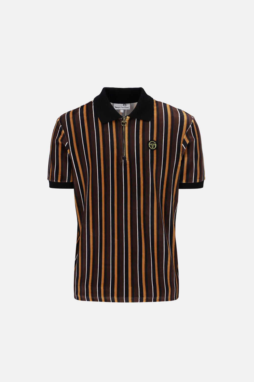A beautiful velour Sergio Tacchini polo, with contrast pinstripe detailing to chest, a gold zipper fastening to placket and embroidered ST monogram logo.