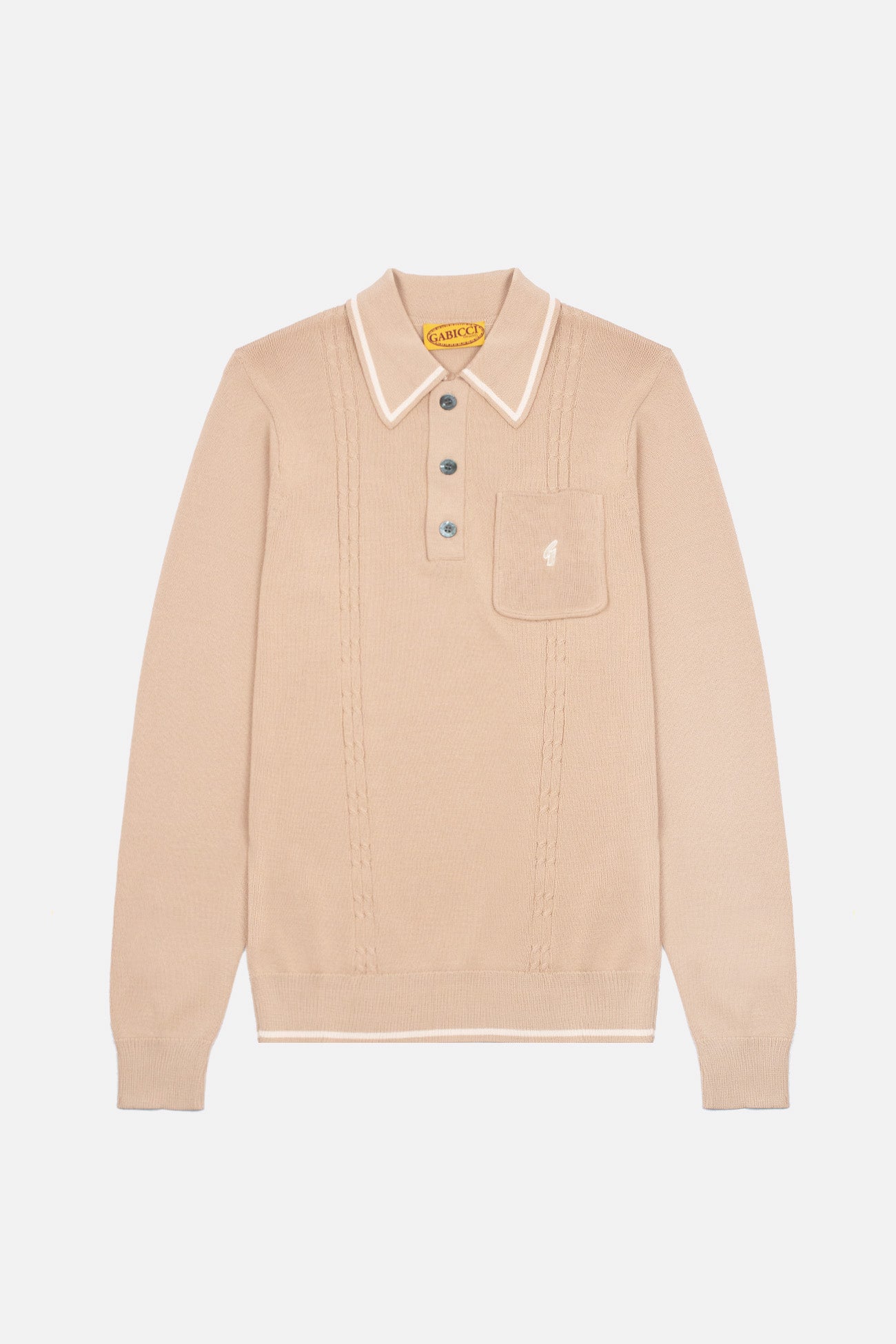 A long sleeve polo knit with a colour matched vertical embroidered cable knit. The design also features contrast tipping to the collar and hemline and a chest pocket with the iconic embroidered G, branding made famous on Gabicci knitwear from the late 70s and early 80s.