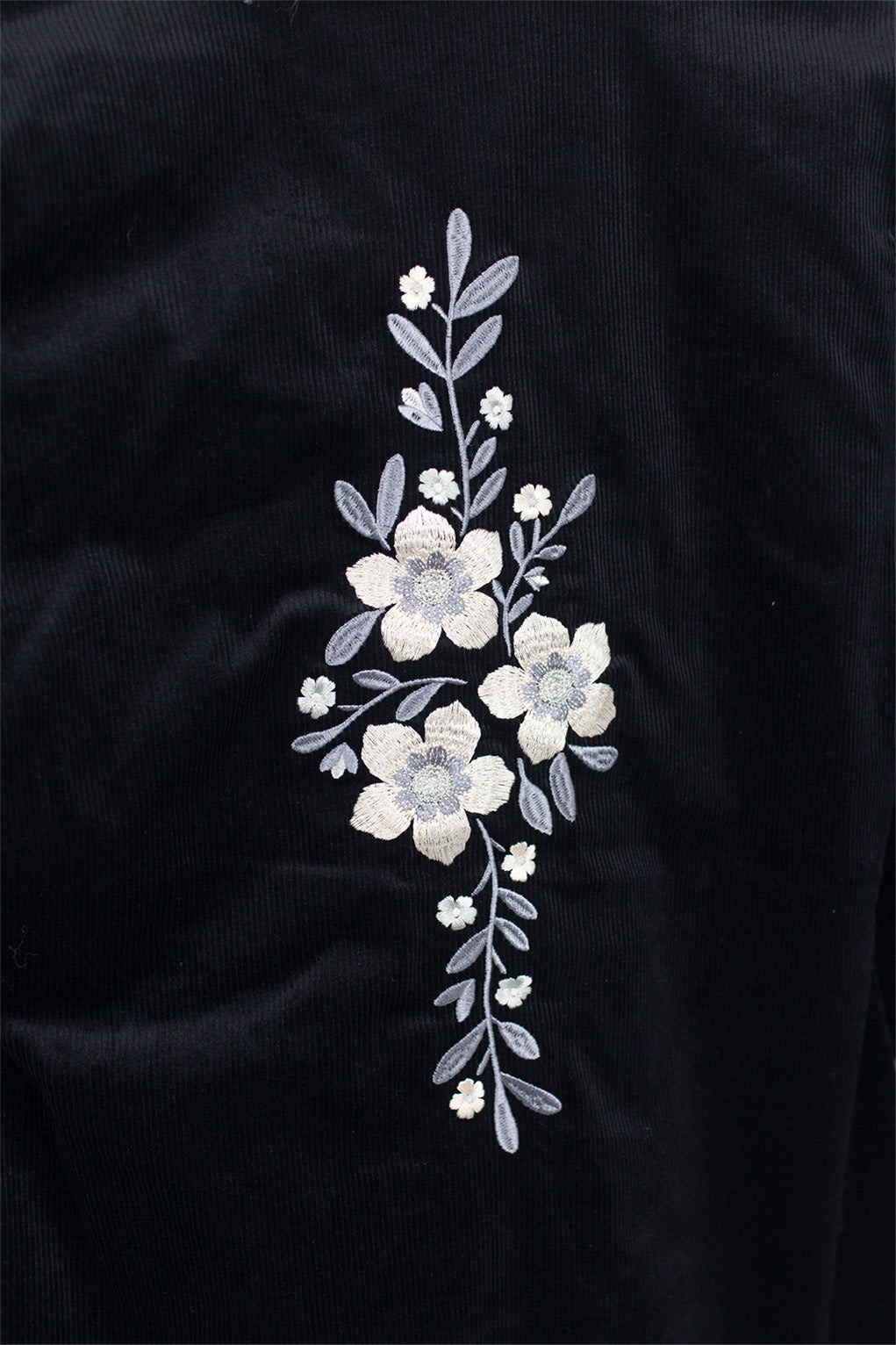 Step out in style with this truly unique, vintage-inspired Penny Lane coat. Crafted from rich, midnight black corduroy, and finished off with dreamy silver-toned, floral, hand-drawn embroidery. The clover coat is a true statement piece that embodies bohemian glamour and 70s spirit.