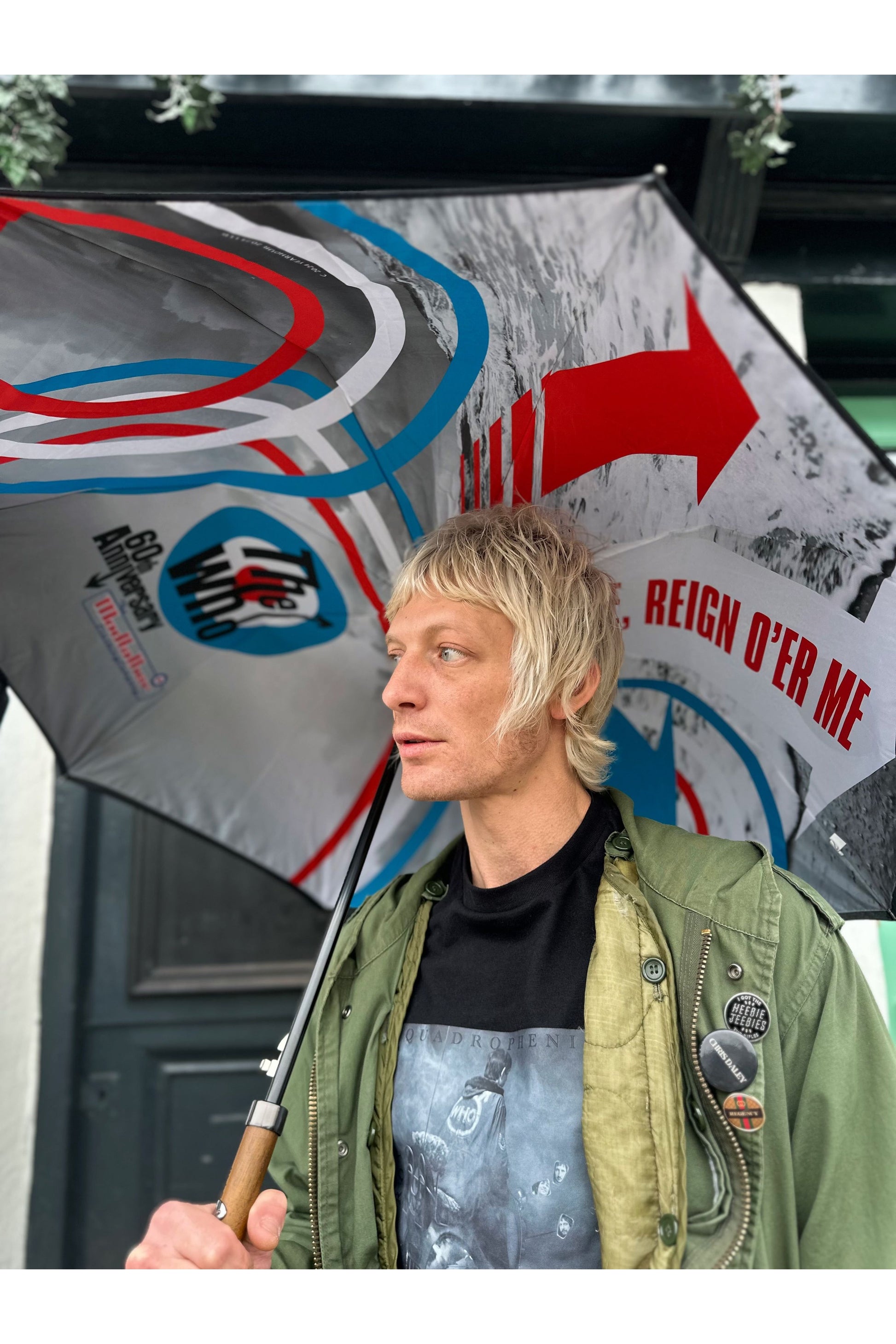 In a nod to 'I am the Sea', the opening track from The Who's 6th studio album 'Quadrophenia', the umbrella canopy features a stunning black and grey image of the sea, as a wave washes onto the shoreline with storm clouds seen on the horizon.