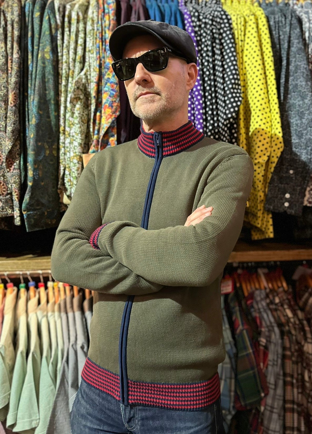 Ivy green, long sleeved, knitted zip through cardigan with equestrian red tipping on contrast navy blue neck, cuffs and waistband ribs. 7 gauge medium weight, retro style knitwear.