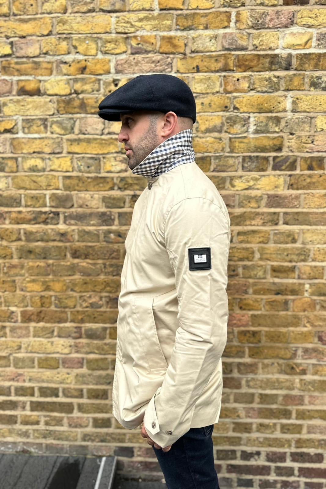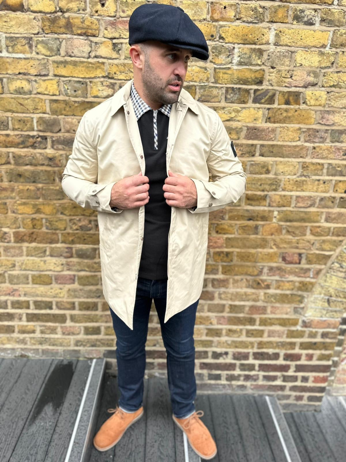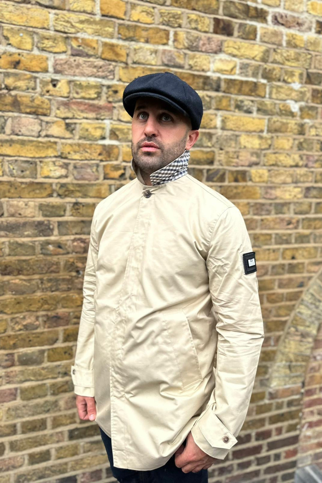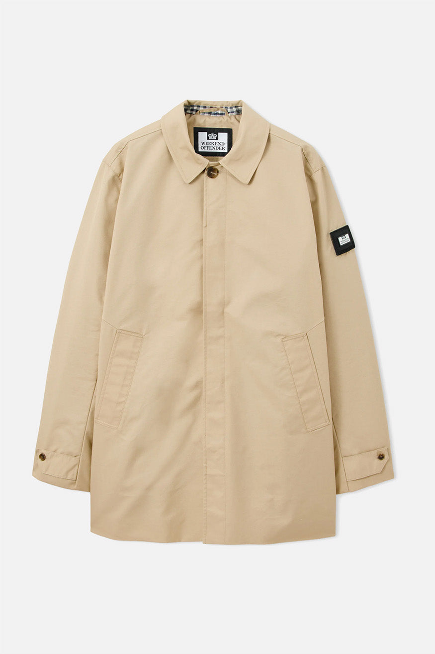 Mid length Mac made from tightly woven twill featuring a subtle diagonal weave and slight sheen to its surface. This mid-weight cotton blend fabric offers versatility and durability which lends itself perfectly to the structured finish of overcoats. Treated with a Durable Water Repellent (DWR) coating.